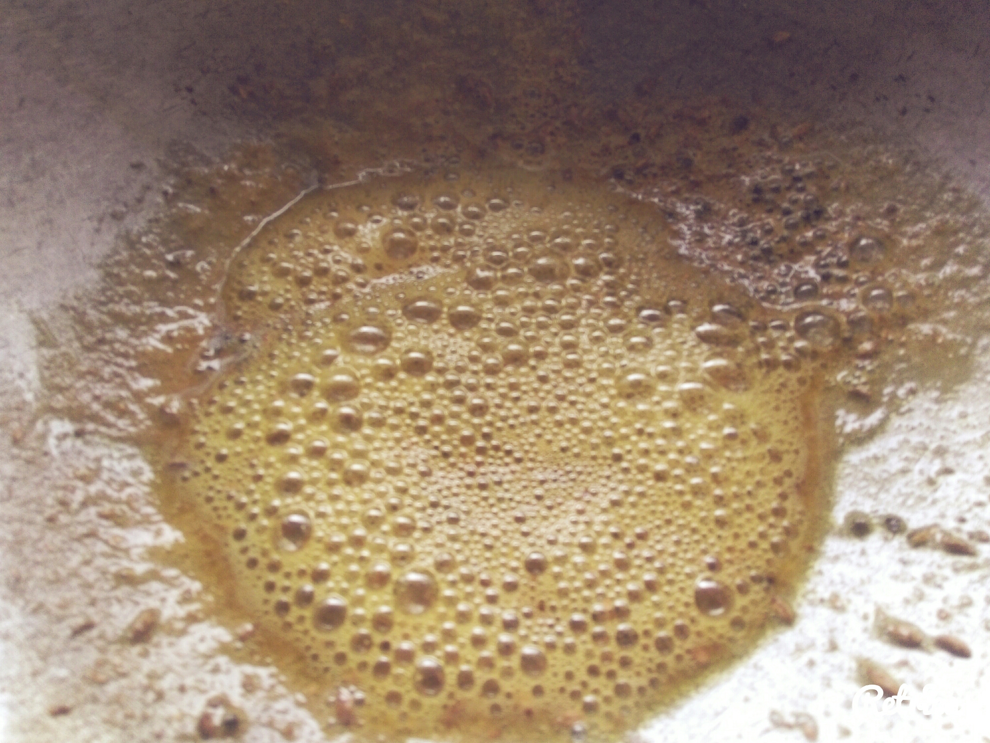 1.Take a wok and heat mustard oil till it smokes. Add mustard seeds, cumin seeds and when it crackles, add coriander powder and wheat flour and mix it well for 2 minutes.