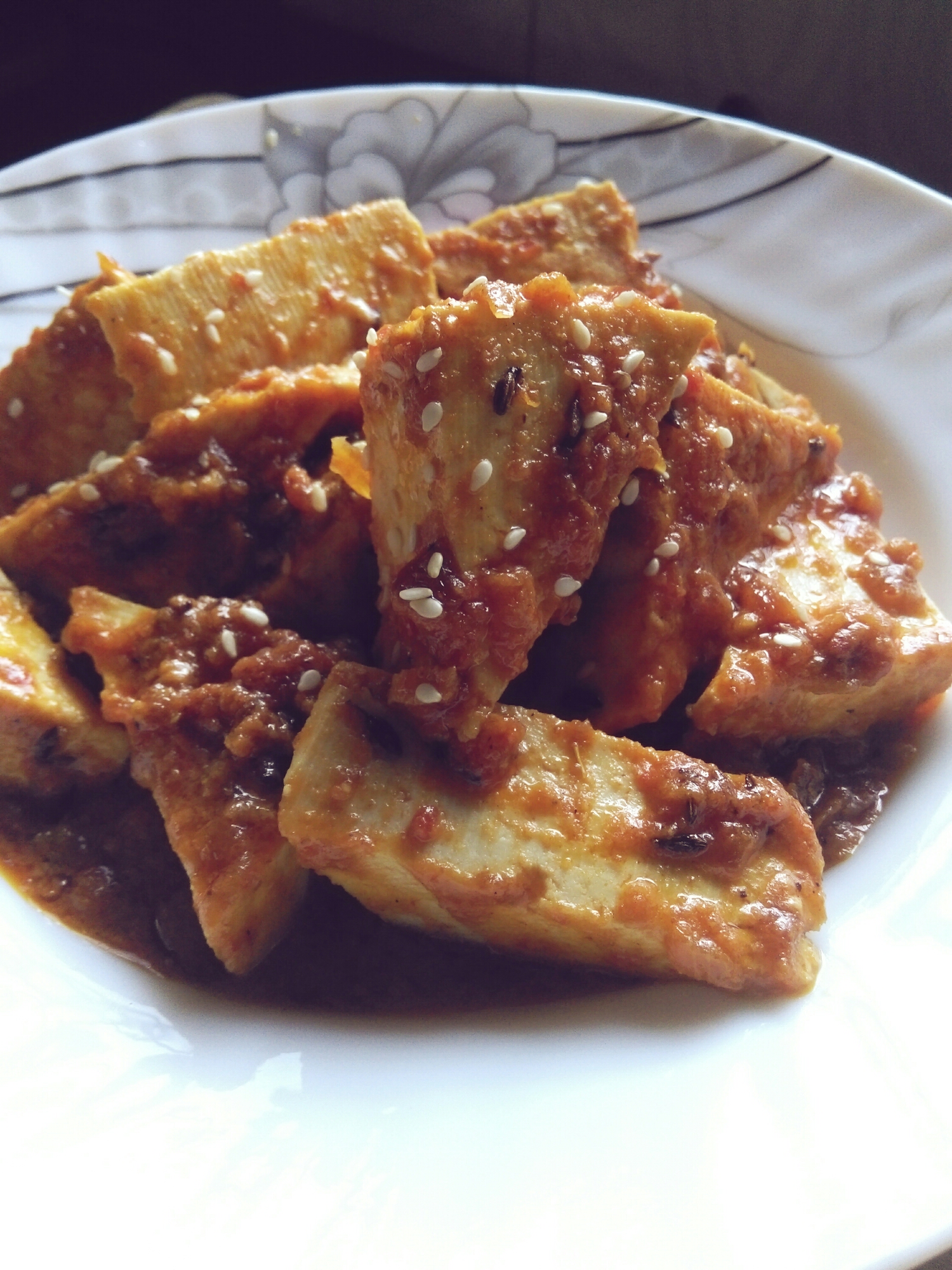 4. Once ur onion tomato masala leaves oil now u can add tofu cubes and mix it all well add cream or malai mix all well and cover it and let it be cook for atleast 7-8mins on low flame.