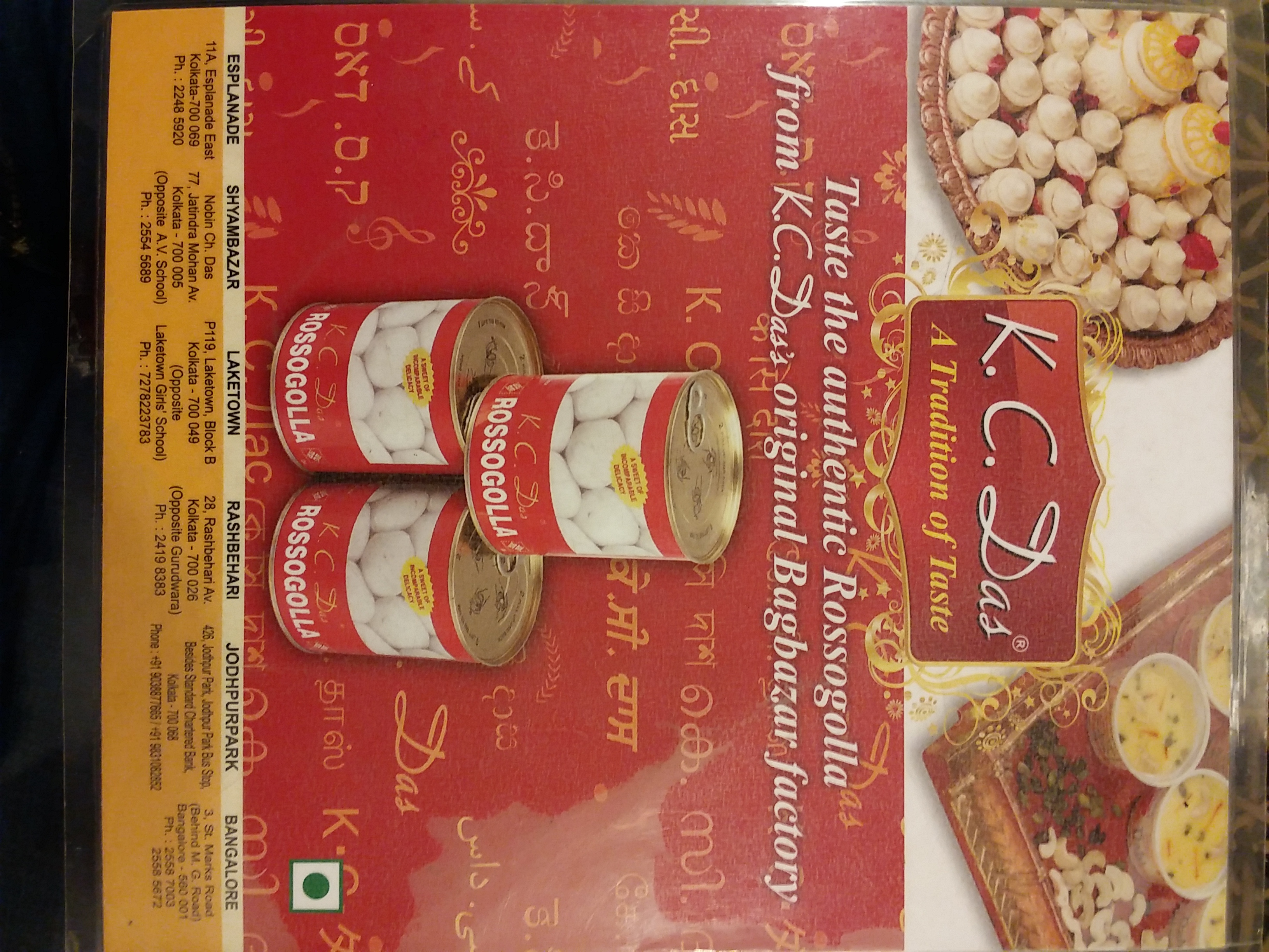 Besides Rasogolla and Rajbhog KC Das serves a wide range of sweets like sondesh,jolbhora,talsansh,ladycany,rasomalai,malpua and so on.for a variation to the tastebuds they r also serving snacs like singhara,chop,peas kachouri,radhaballavi etc.most striking feature is the variation of dahis .mishti doi,kesar doi,aam doi etc