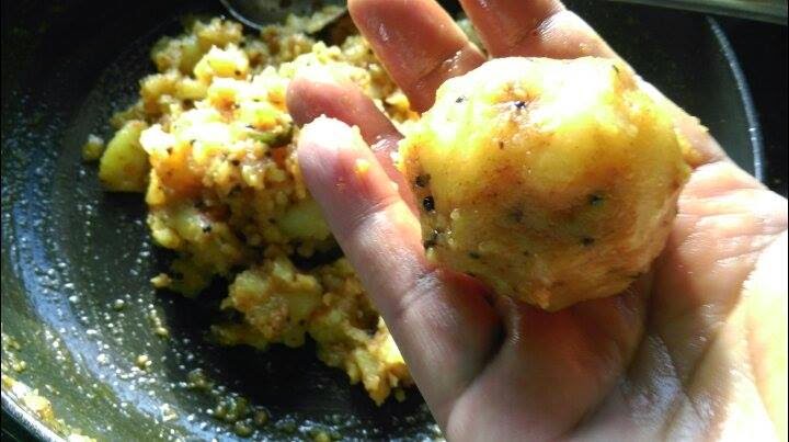 1. Heat oil in a pan and add curry leaves, mustard seeds to it. When they crackle add garlic paste and mashed potatoes.