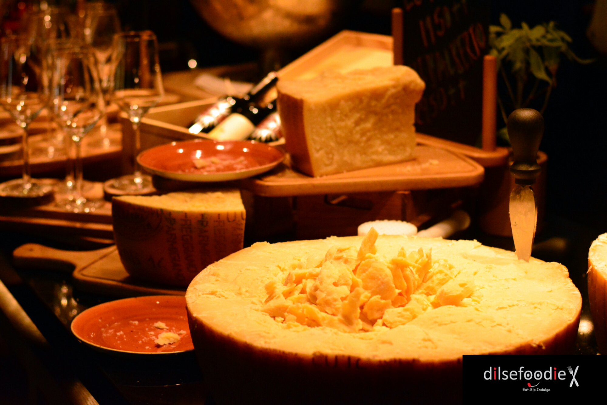 The Ravioli carrying a soufle of 3 kinds of cheese with Parmesan being the centric of it was a cheesy affair specially made to tickle the palate and did all the wonders. It was so smooth and delectable that we just couldn’t stop ordering for more over and over again. The breads and bruschetta were now served and wine kept us all engaged in this cheesy conversation. Italian flavors such as Culatello from Zibello with aged parmesan cheese served with chili jam and mustard from Cremona city, Risotto from Sibari with stewed duck leg, breast confit, alba truffle pate and gelato of Parmesan stravecchio- 36 months to a homemade fettuccine with forest wild mushrooms with 12 months aged Parmesan cheese sauce.