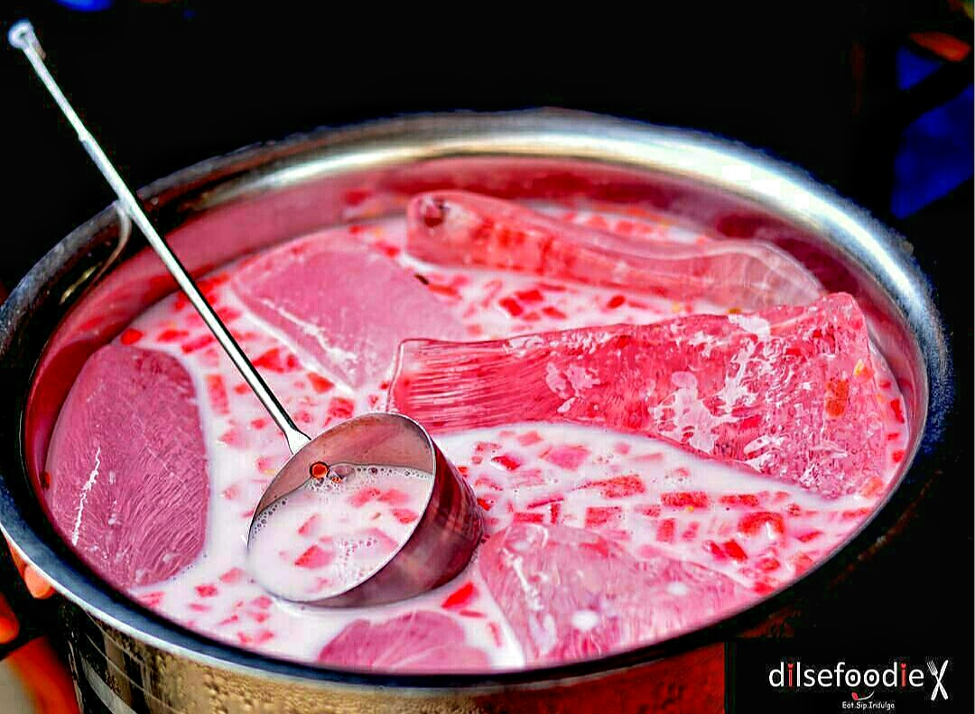 6. Pyaar Mohabbat Sharbat– A very famous drink sold outside 1149, Matia Mahal, near Jama Masjid. Beat the heat with this mouth watering unique and very cheap sharbat. It is refreshing and cool best for those drenched and looking for something rejuvenating in Old Delhi. This is basically flavoured milk with watermelon chunks in it, creating a pretty pink hue.
