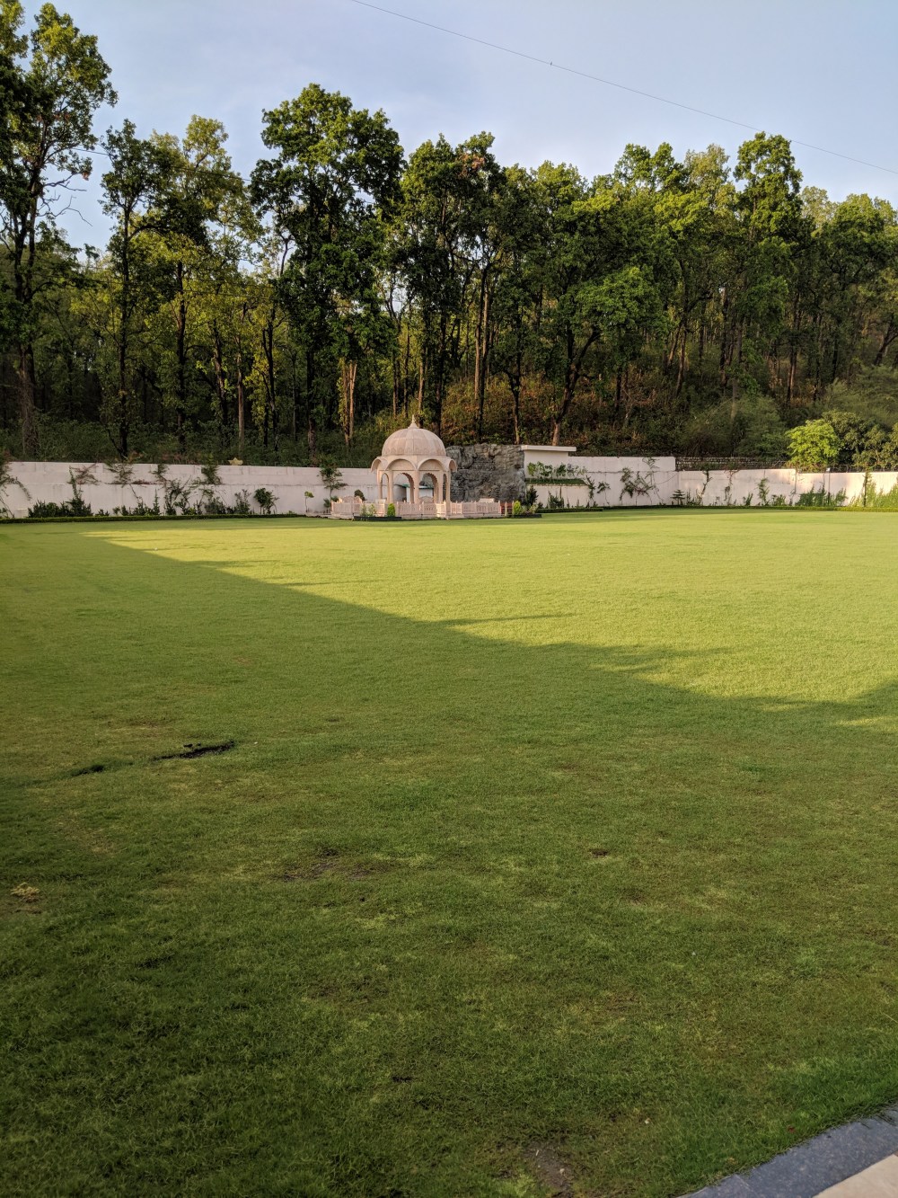 Garden Lawns landscaped with stone cut Rajasthani Chatri and a serene forest backdrop is the